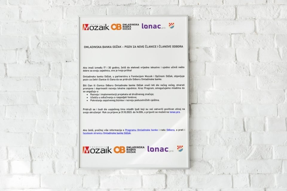 Omladinska banka Odžak u suradnji s Fondacijom Mozaik i Općinom Odžak objavljuje poziv za četiri članice ili člana da se pridruže Odboru Omladinske banke.